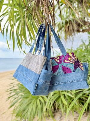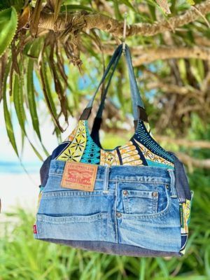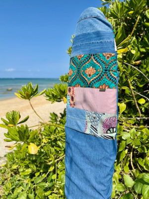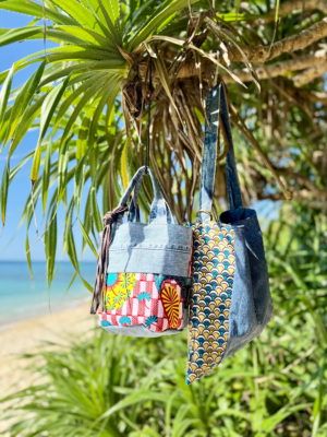 アースカラーとブルーの組み合わせにイエロー系のブロックプリントをパッチワーク。マスタード色のファスナー付き🌻